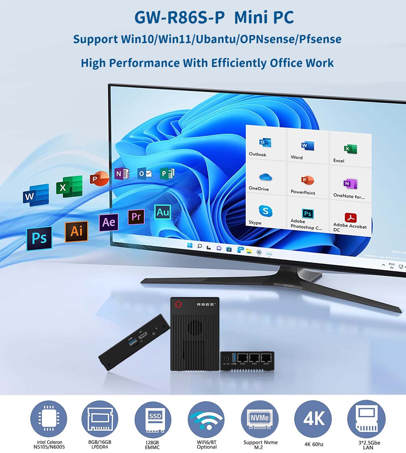 The G1/G2 model use Intel@Celeron@Processor N5105 4M Cache,Up to 2.9GHz, TDP 10W The G3 model use Intel@Celeron@Processor N6005 4M Cache,Up to 3.3GHz, TDP 10W Intel® UHD Graphics(450-900Mhz) ,Support 4K 60Hz display AES-NI hardware support |